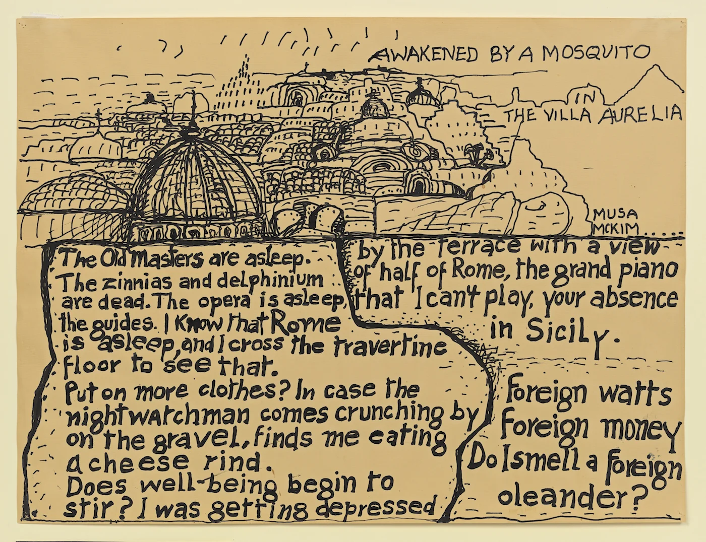 Philip Guston, "Awakened by a Mosquito", circa 1972-1975, collaborative poem-picture with wife Musa McKim, ink on paper. Photo by Genevieve Hanson.